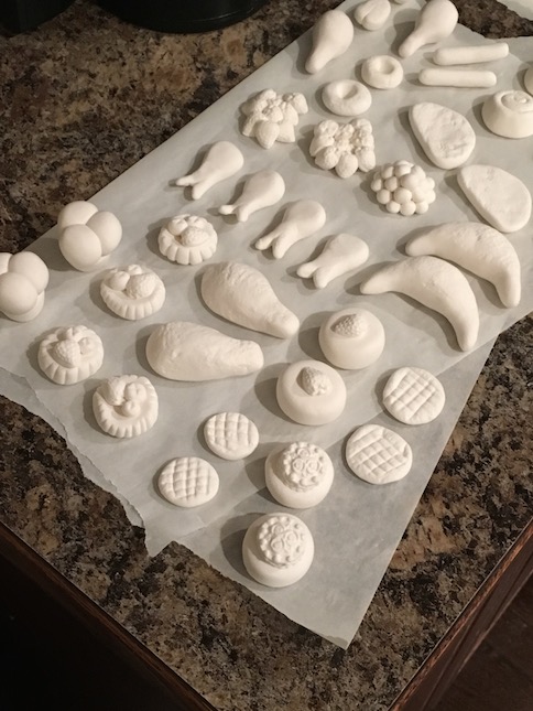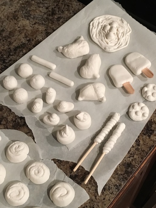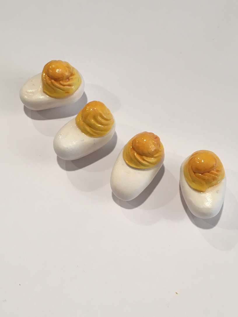 Deviled Eggs – We have a whipped cream mold that we always use for our polymer clay. It works wonders for Model Magic too. It was perfect to make the yolks of our deviled eggs. Once these were dry, we just painted the yolks yellow, and brushed a bit of brownish red chalk on top.