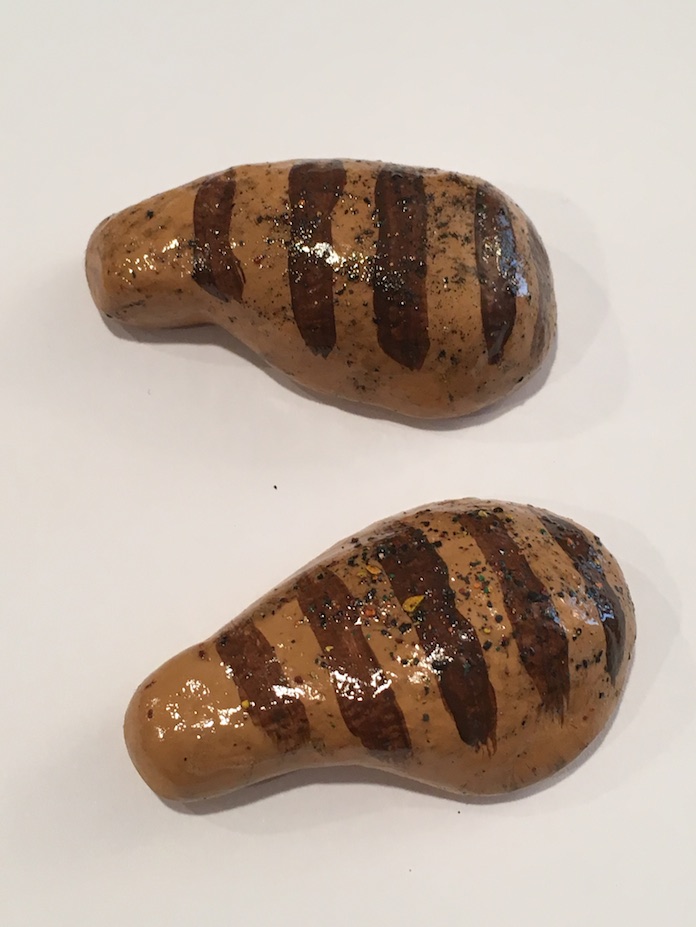 Chicken – Shape your clay into a chicken breast. Use a toothbrush on top for texture. Once dry, paint a tan colour. Use brown to paint grill marks on top. Varnish. Before the varnish dries, scrape flecks of brown and yellow chalk on top. Once it dries again, dab some varnish on the flecks. DON’T brush the flecks as they will streak. Only dab it on there to seal the chalk sprinkles. If you don’t have chalk, pepper or actual spices would work just as well, and it won’t streak. 🙂