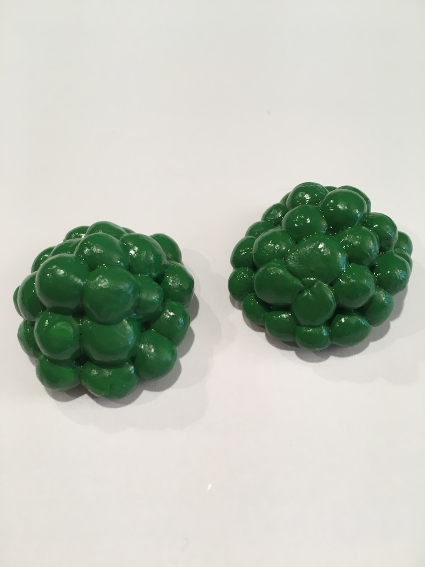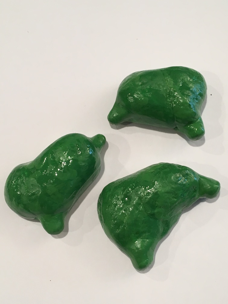 Peas – These are so easy. Just roll a bunch of uniform sized balls, and stick them in a pile. Once dry, paint the pile green.