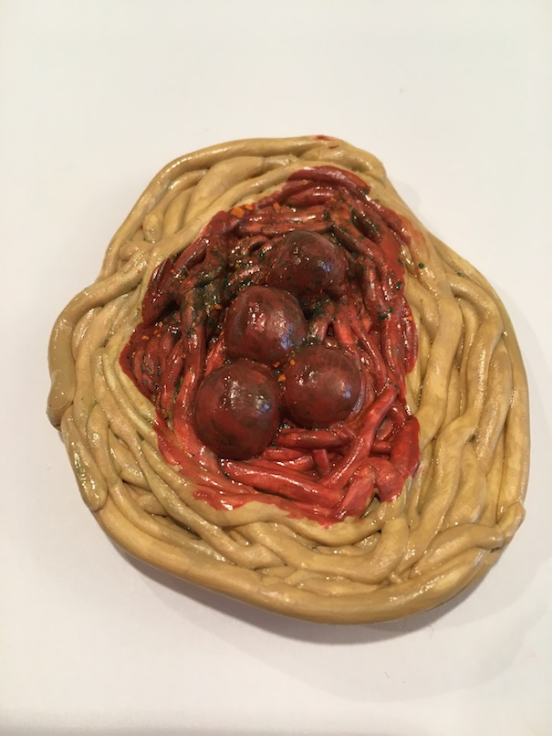 Spaghetti – Roll strips of noodles. Spiral the noodles into a pile. Once you have enough noodles, roll out four meatballs, and stick them in the middle of your pile. Once dry, paint your noodles a tan colour. Paint the meatballs brown. Cover the meatballs in orange-red paint for sauce. Scrape green and orange chalk flecks on top for parsley and parmesan. Dab varnish on top. DON’T brush the varnish on as it will streak the chalk. If you don’t have chalk, check your actual spice cupboard. 🙂