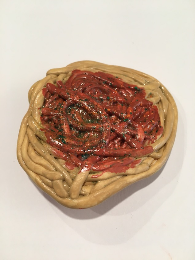 If your dolls are vegetarian and prefer no meatballs, flip your spaghetti over, and paint some sauce on the bottom using the same method as above.