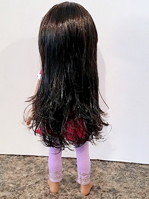 Her hair falls all the way down her back in nice waves. She is 14″ tall. I believe that’s about the same size as a Wellie Wisher doll? Her entire body is made of plastic too, just like the Wellie Wishers.