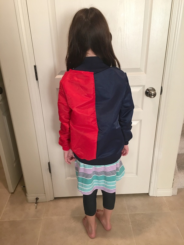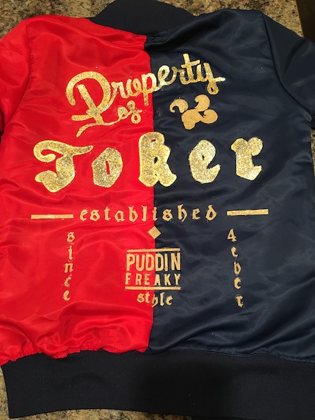 Next, I printed a logo from online for the back of the jacket. Since the jacket was made of nylon, an iron on transfer would not work, (I tried) so instead I printed the logo out onto card stock paper, painted it gold, and glittered it up. Then I cut it all out, and hot glued it right to the back of the coat. This was painstaking, but the result was worth it!