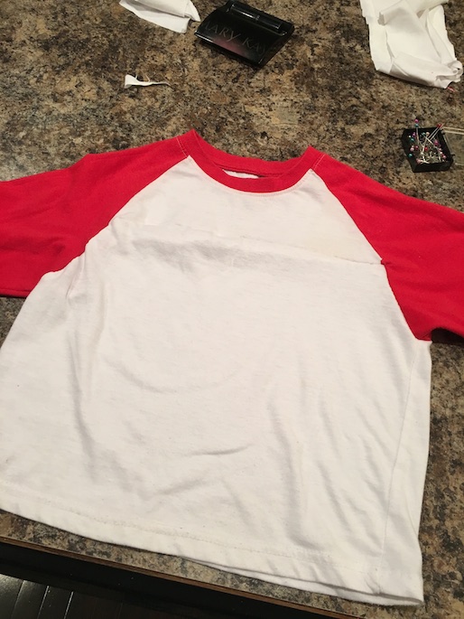 For the shirt, the only one that I could find at the thrift store already had a different logo on it. We tried everything to cover the logo. We even tried bleaching it out, but nothing seemed to work.