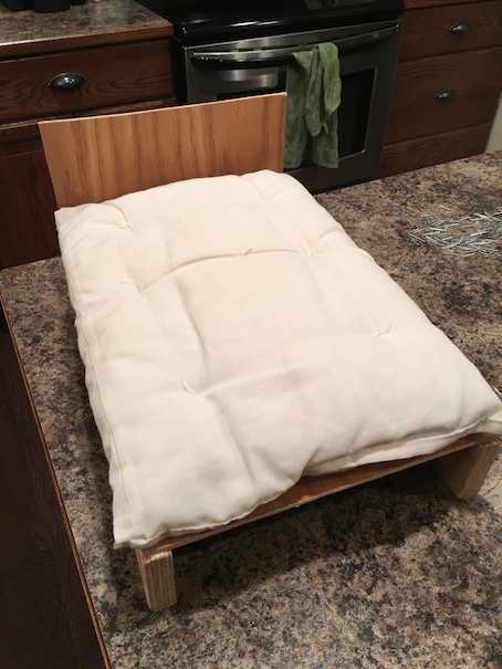 I then used the mattress to work out the dimensions of the bed. Basically I just found some wood pieces that matched the mattress, and I made a few cuts to bring everything else to the correct size. I wasn’t looking for a major project. I just wanted something quick and easy. In other words, I just winged it. LOL!