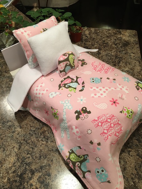 The only thing left to do was to make some bedding. I had some leftover fleece, and some fat quarters of flannel fabric, so I whipped up some cute blankets and pillows.