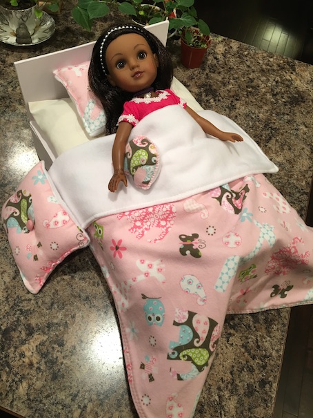 Leena is very happy and cozy in her new bed! She was getting tired of sleeping on the living room chair in the doll condo. Now all she needs is a pair of pajamas. Maybe this jammie pattern over atΒ PixieFaire will do the trick. π