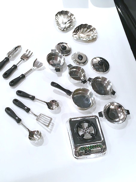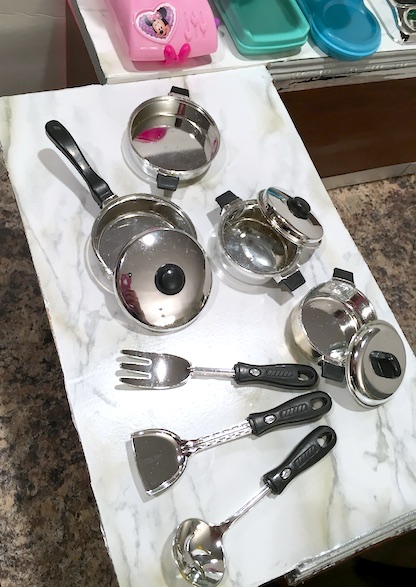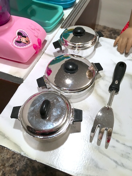 These are the utensils that come with the set. They are a bit larger than I would have liked, but they still work for our dolls, except for the potato peeler on the end. That seems to be the most unreasonably sized utensil in the bunch since it is as large as the soup ladle. LOL! π