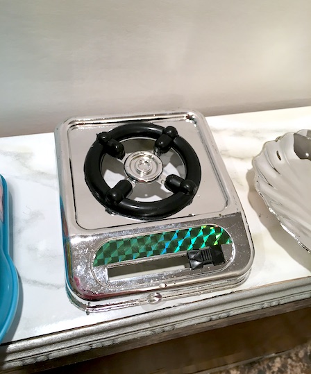 Here is the little cooktop element. It is perfect for our kitchen as we don’t have a stove. π It would also be a perfect little camp stove. The slider works too. It’s not high tech or anything, (more plastic) but it’s fun for doll play.