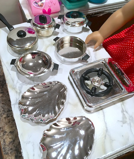 I was immediately floored because usually the dollar store cooking sets strike out for 18 inch doll purposes. The pieces are usually way too big, but this set seems perfect to me!