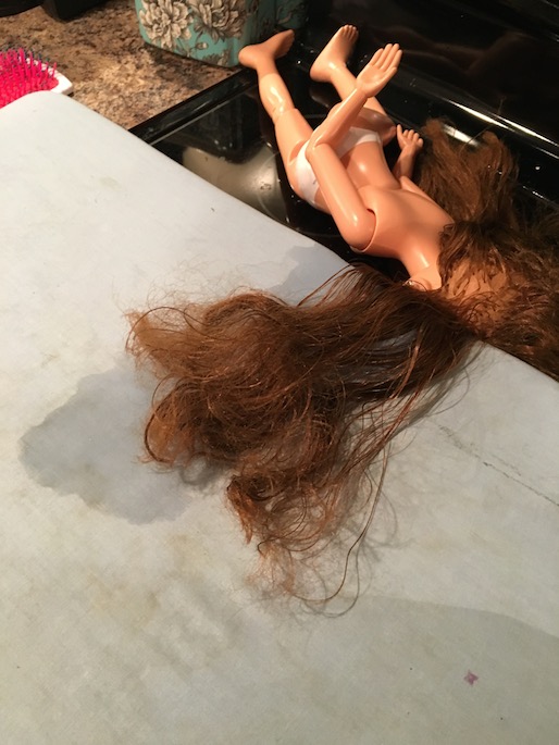 Now I don’t recommend doing this on a more expensive doll’s hair, but this doll has hair the texture of a Barbie doll, so I couldn’t see that it would ruin it any more than it already was. Besides, I only paid $1.00 for the doll, so if I did wreck it, I wouldn’t be that heartbroken.