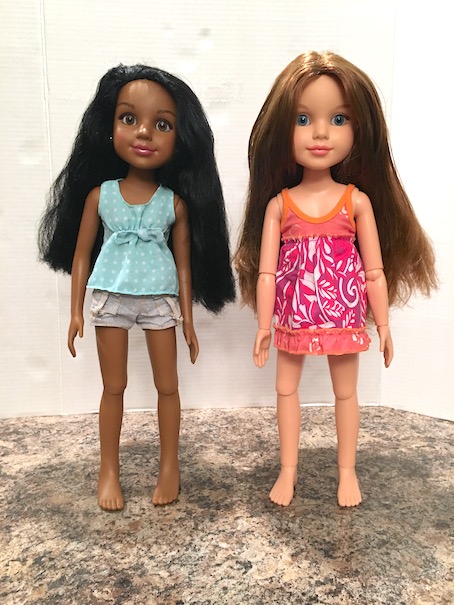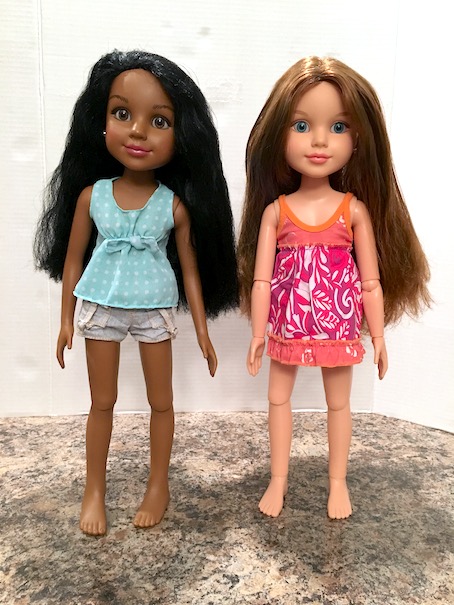 Here’s a look at the two girls together. Right off you can see that there are some big differences. For one, Addy has a lot more joints than Suri does. I put them both in short sleeves, so that you could see the differences in their joints.