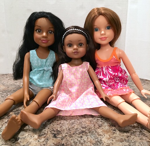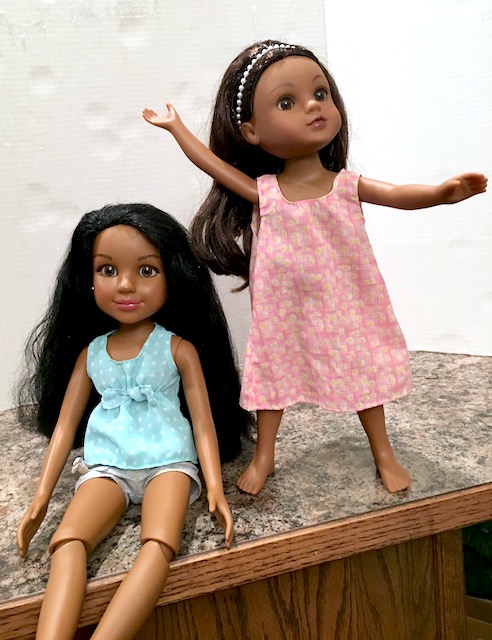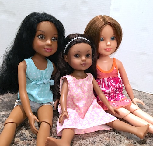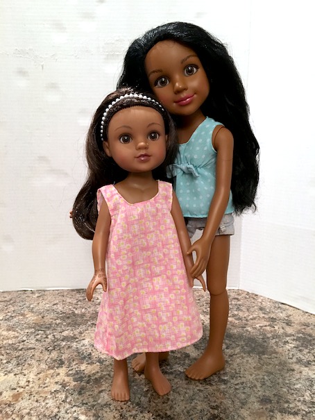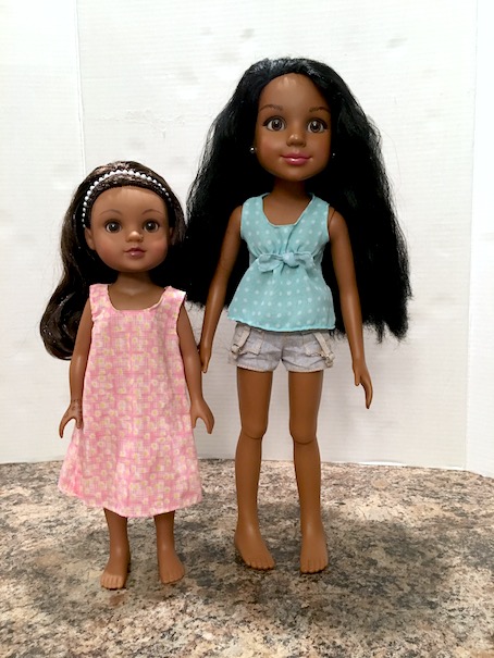 Leena is a 14 inch doll similar in size to the AG Wellie Wishers. Suri is 18 inches tall, but her petite frame gives her similar features to the Hearts4Hearts dolls.