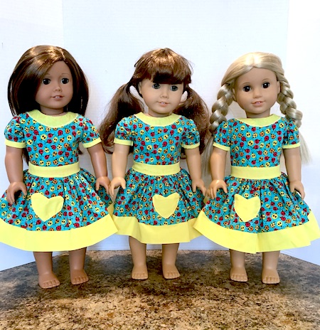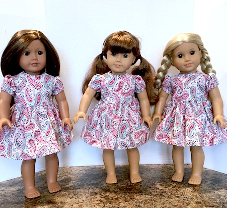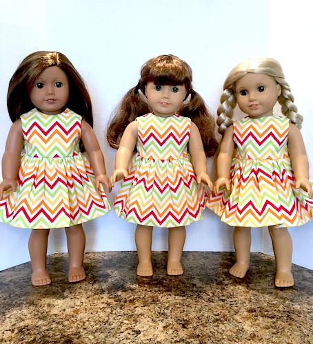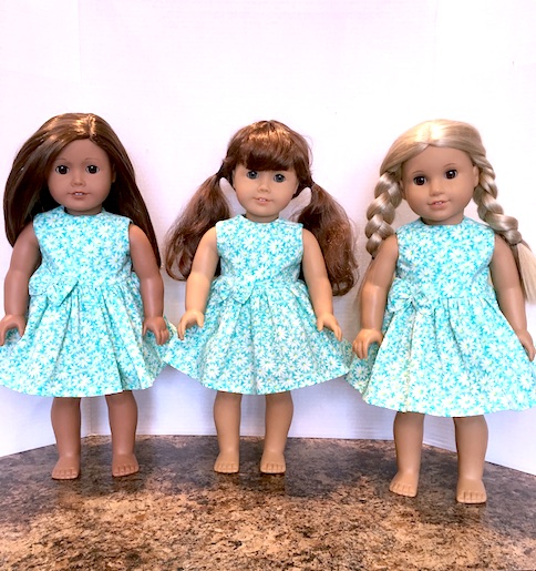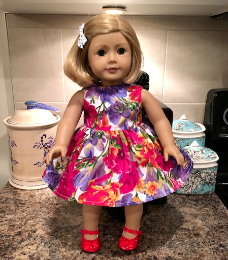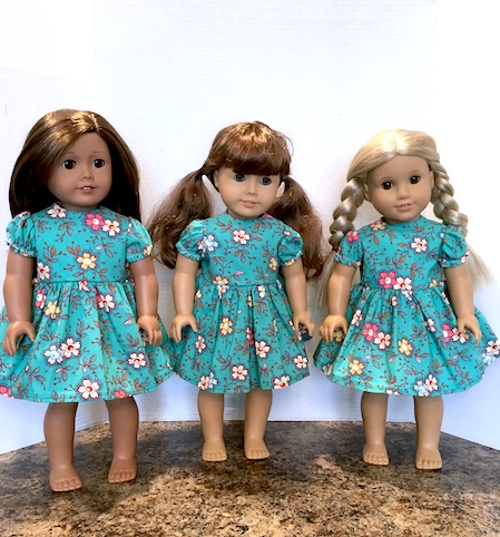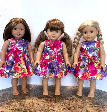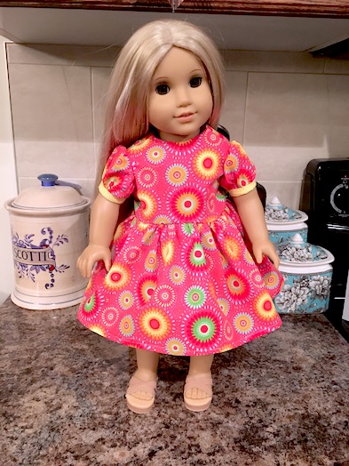 When choosing fabrics to make doll clothes, it is essential that you find fabrics with small design patterns or dense colours like the dress above. That way a fair amount of the design will display in your finished product.