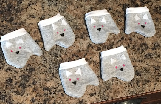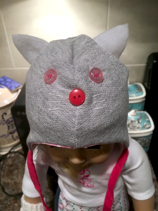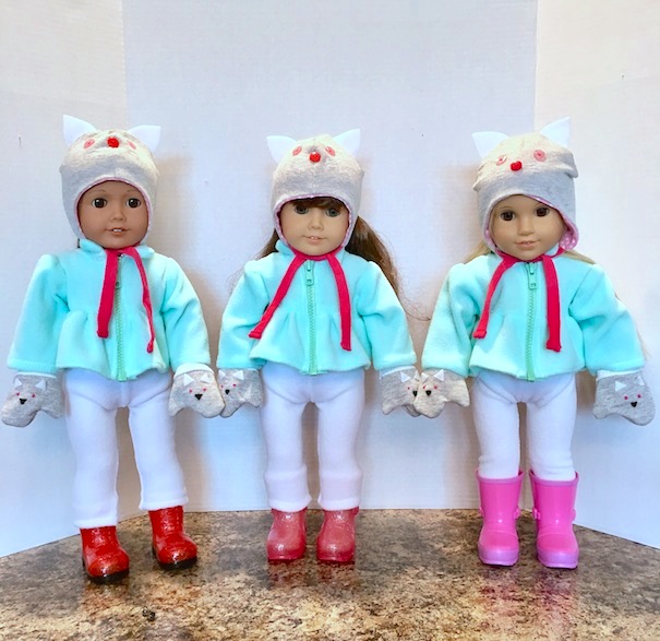 Another pattern from the Doll Fashion Studio book was a set of hat and mitts. Since it was so cold outside, I thought that the girl’s dolls would definitely need these. The kitty cat faces are so adorable! 🙂