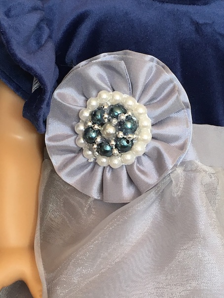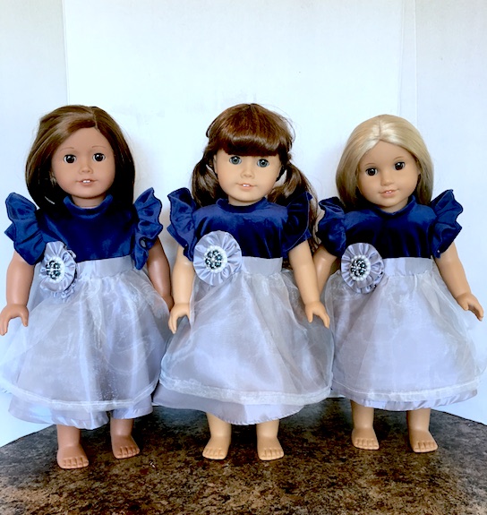 On to the Christmas dress. Since it was so close to Christmas, I decided that the dolls had to have a Christmas dress, so I made this pretty blue velvet number with ruffled sleeves and silver taffeta. The pattern for this can also be found in the Doll Fashion Studio book.