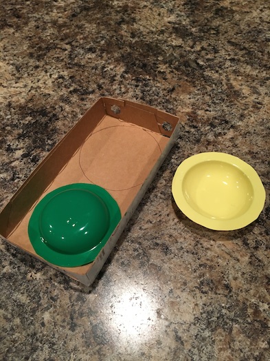Using an exacto knife, carefully cut out the inner circles only. You may need a parent’s help with this. Be sure that your bowls fit inside.