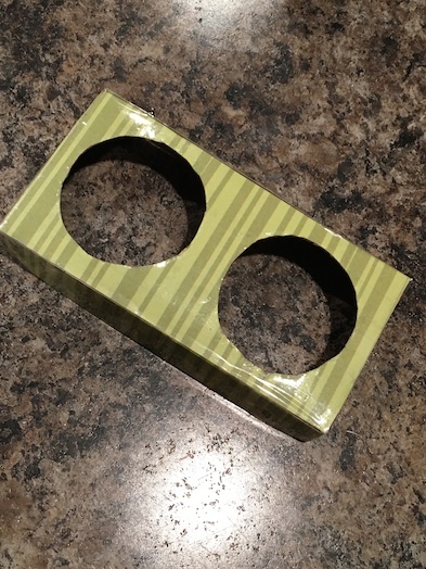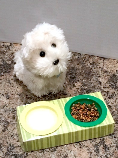 And you’re done! You can glue the bowls in or leave them removable. It’s up to you. Now fill the bowls with whatever you like. We used a glue that dries clear for the water bowl. It’s not quite dry yet. 🙂