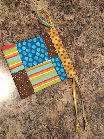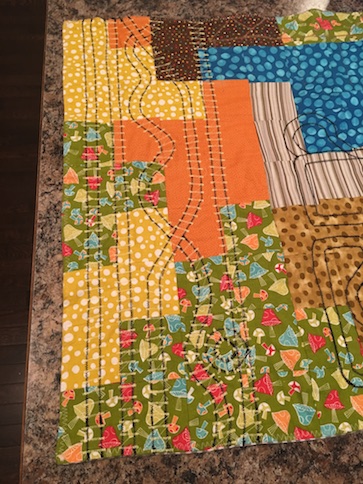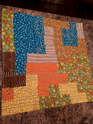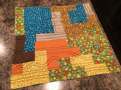 The first thing I did was gather my fabrics. I wanted to create a double sided mat that resembled a quilt with abstract fabrics to represent different types of landscape. I had all of the fabric on hand to create this quilt mat. I used 3×3 cotton fabric squares, 9 rows of 8 in a slightly random pattern. I did not use any quilt batting for this. I just sewed a piece of flannel to the back.