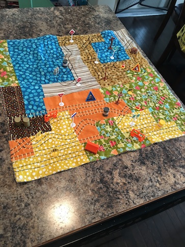 Anyway, I don’t often get to do fun sewing projects for the wee little men in my life. Usually they just want Lego or cars for their birthdays, but when I came across some mini Thomas trains, I knew that my 3 year old nephew would love them. I also knew that I just had to make a take along train mat to go with them.