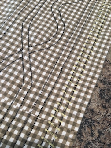 Then I pinned it right onto the quilt mat, and proceeded to sew the train tracks on right through the paper. I used a regular straight stitch for this. After I tore off the paper, I then reinforced my lines with a short zig zag stitch.