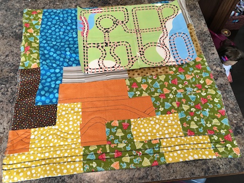 This is what the finished landscape side looks like. The stitching for the station house roof peaks and pockets blends nicely into the scenery on the left side.img_5739