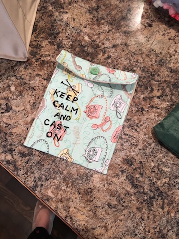 I also included this cute little pouch to hold her scissors, crochet hooks, and small needles. The retro telephone print matches the lining of the knitting bag. I think that it is so charming! 🙂