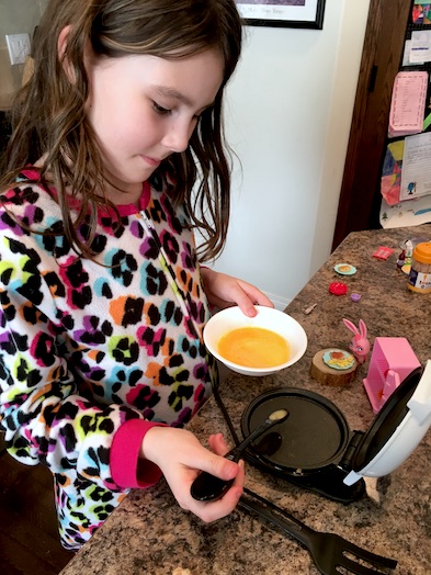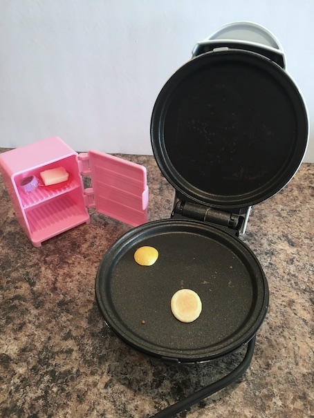 Here’s the mini griddle! We are using a 1/8 teaspoon to scoop out tiny scoops of pancake batter.
