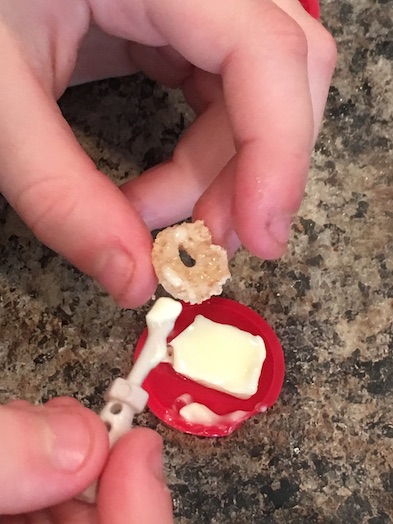 Breakfast is served!! 🙂 Spread jam on your mini toast using a toothpick or mini utensil.