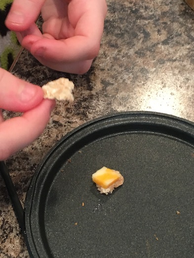 We just cut a tiny bread slice out of a regular slice of bread. Then we toasted it on the grill.