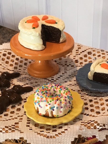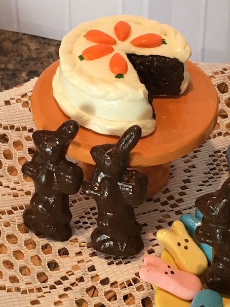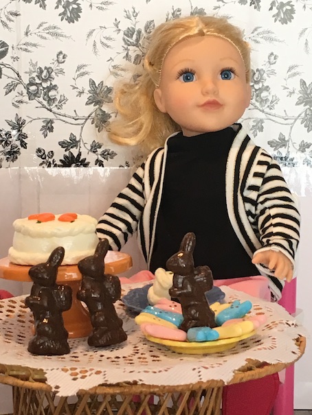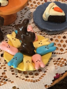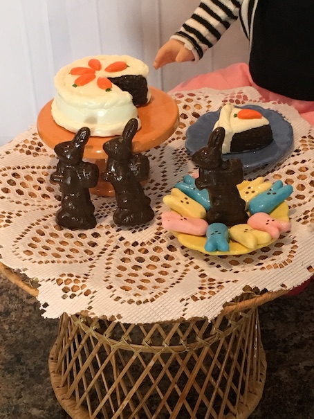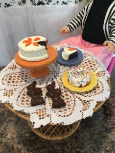 Anyway, onto the treats! We made a carrot cake, three chocolate bunnies, peeps in three colours and a rainbow bit pound cake. Our girl Summer is here to show it all off! 🙂
