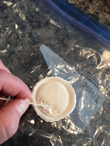 Step Four: Using a toothpick gently pull and poke at the circle that you created with the tablespoon. This will add the texture.