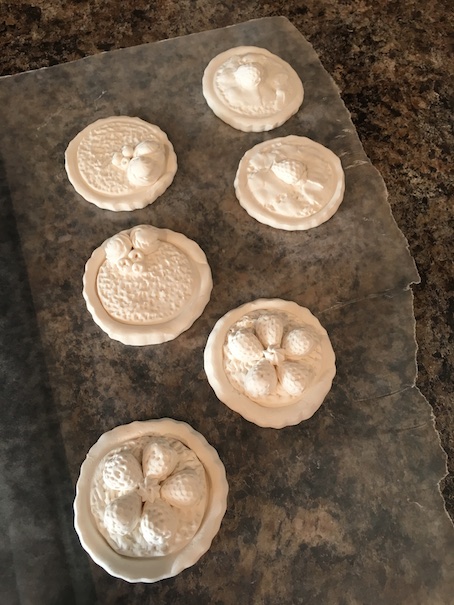 Here are the first batch of tarts ready for paint! Make sure you let your tarts dry completely before painting. I often leave my air dry clay projects to dry for at least two days or so. Looking at these now, I have to laugh a little though. They are kind of rough. 😛 Oh well, the dolls don’t mind at all! Since then, I have made many more of these tarts just learning as I go. I can’t emphasize enough how important it is not to touch the clay with your fingers as you work. That makes all the difference in the world.