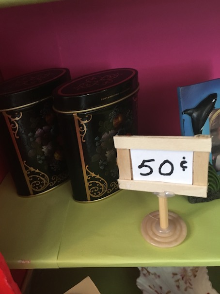 These are some doll sized thrift store canisters we found that work really well with this set.
