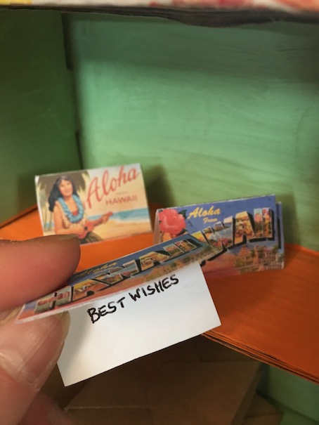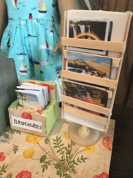 On top of the counter we have travel brochures and a postcard rack full of Hawaiian postcards.