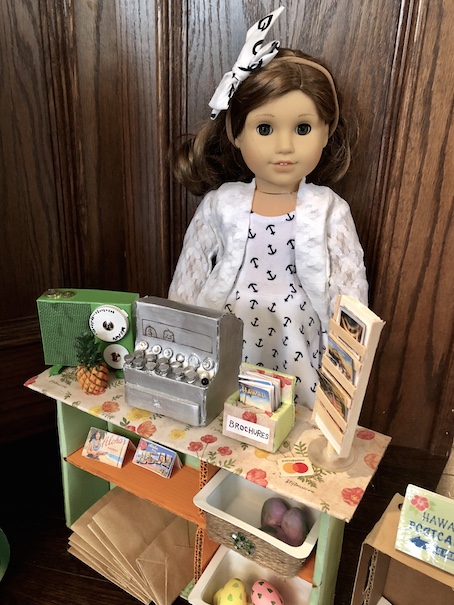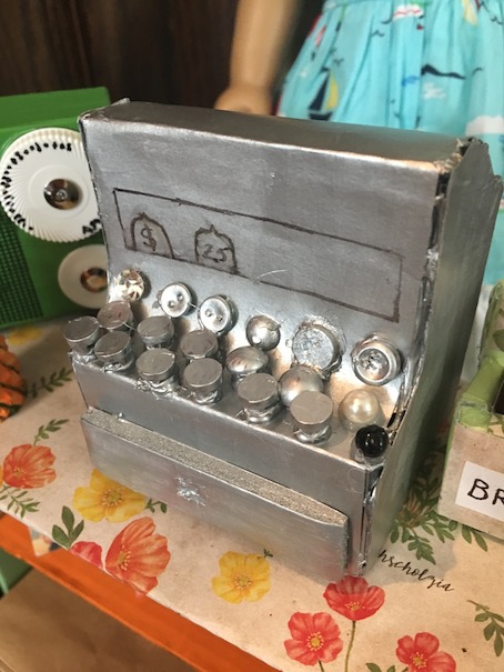 Here is our finished product! We even used a piece of foam core board to make a cash drawer at the bottom. We just hot glued it on there and painted it silver to match. We used a sharpie marker to draw the price window as well, but you can do whatever you like. 🙂 We also found this little knob to glue on the side. We love how this little cash register turned out! We’ve been wanting a cash register for the dolls for what seems like forever, and this one is the perfect size! It’s perfect for Nanea’s family market, but I can see it getting tons of future use as well. 🙂