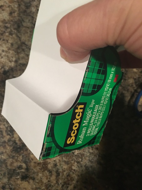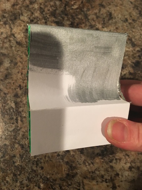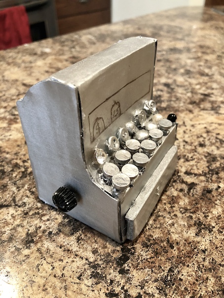 Here is the scotch tape box we will be using. Take some sturdy card stock paper, and cut and measure a long strip to wrap around your box. Hot glue into place. Be sure to follow the shape of the box. Keep wrapping and gluing until the box is fully covered, front to back, and top to bottom. Next, it’s time to cover the sides. Trace the side pieces onto some card stock paper. Then cut them out, and hot glue them in place.All it needs now is a coat of paint!We used two coats of silver acrylic paint for ours. Once your cash register is all painted, it’s time to add the keys.