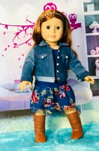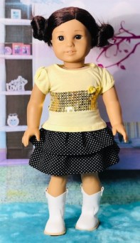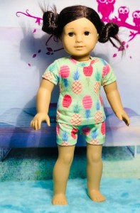 Last, I made this pair of pajamas from a pair that my daughter used to wear. I love the pineapples! The yellow top can also be worn with the pineapple shorts or as a separate clothing item. I used a pattern by All Dolled up called Whimsy. Unfortunately, that pattern is no longer available.Now here is a look at our models! I was so pleased at how I managed to get everything to sort of match. I started out just making a bunch of separate pieces, so I didn’t expect to actually get outfit shots. Also, I have been experimenting with different photo lighting lately, so please bear with me! I am not a professional photographer by any means. LOL!