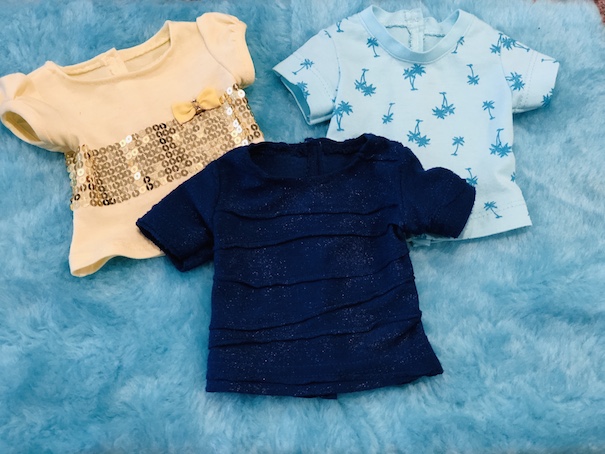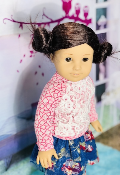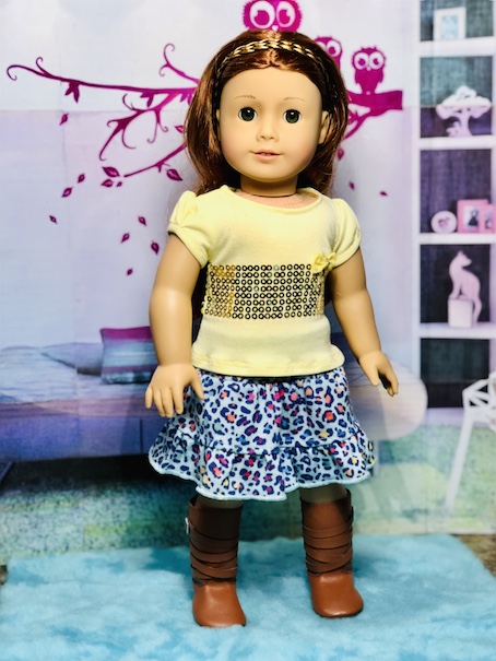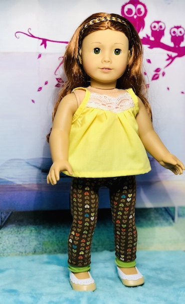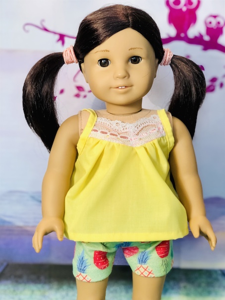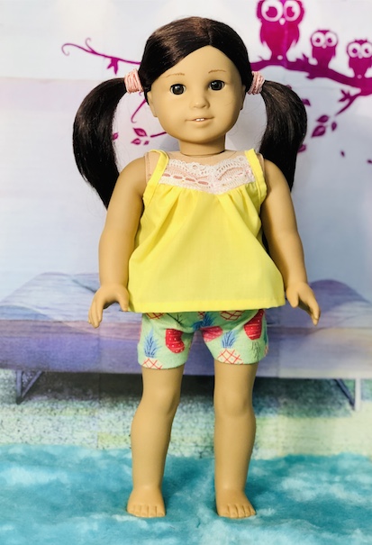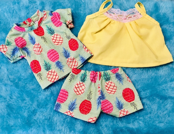 Last, I made this pair of pajamas from a pair that my daughter used to wear. I love the pineapples! The yellow top can also be worn with the pineapple shorts or as a separate clothing item. I used a pattern by All Dolled up called Whimsy. Unfortunately, that pattern is no longer available.Now here is a look at our models! I was so pleased at how I managed to get everything to sort of match. I started out just making a bunch of separate pieces, so I didn’t expect to actually get outfit shots. Also, I have been experimenting with different photo lighting lately, so please bear with me! I am not a professional photographer by any means. LOL!