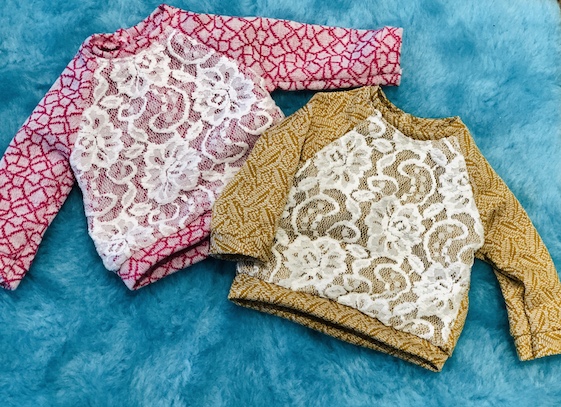 Of course, t-shirts and long sleeved shirts are a must for every modern girl’s wardrobe. I also used the Piccadilly Sweater pattern by Liberty Jane to make some cute lace embellished sweat shirts. This was my second attempt at making these, so the Little Miss has the same ones.