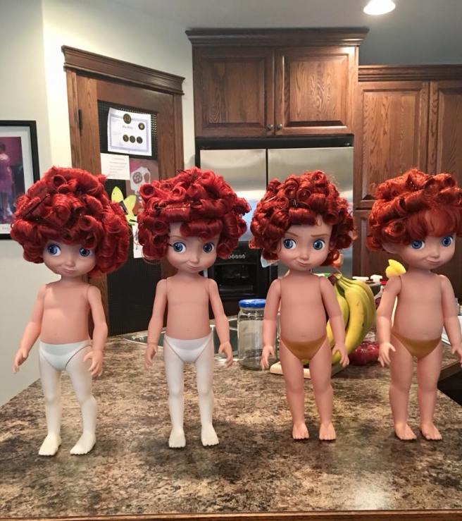 5. More Disney Animator doll outfits. Our thrift store girls are still naked, and forlorn. I keep saying that I’m going to sew outfits for all of them, but so far I’ve only gotten around to cleaning them all up, and getting their hair sorted. Here’s just a few of our lovely Disney girls getting their hair done!