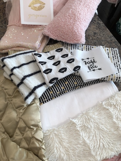 These are the basic colours that we are going for in this room. Gold, pink, black and white.