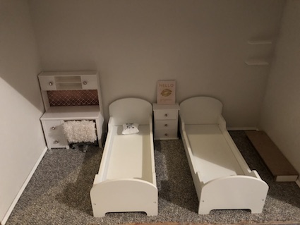 I also spray painted the beds that we have for this room. They had butterflies on them, so I spray painted them all over white instead. I still have to make the mattresses, but I’ve been experimenting with furniture arrangement.