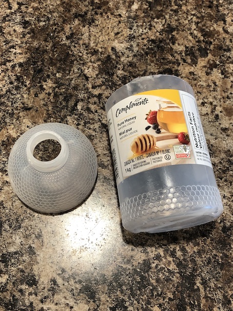 This is the honey container we used. Our honey had expired. Rinse it out, and use the exacto knife to cut off the top. I cut it off first, then I trimmed it with scissors to clean up the edge.