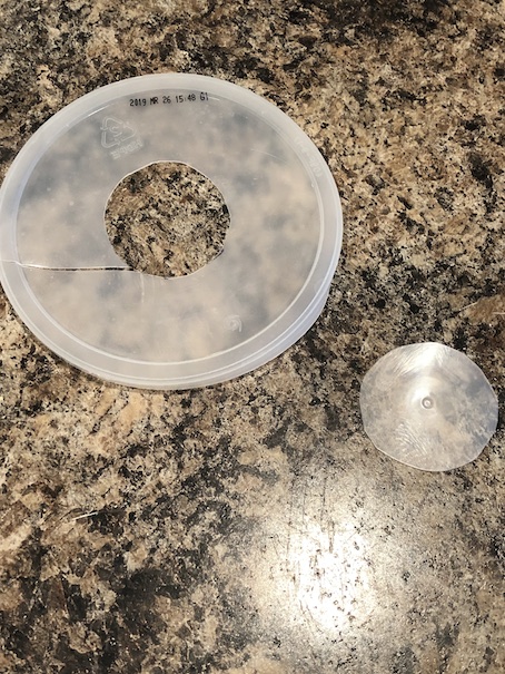 Next, use the exacto blade to carefully cut off the bottle top. You will end up with a dome with a hole in the top. We need to cover that hole with a piece of the plastic yogurt lid.