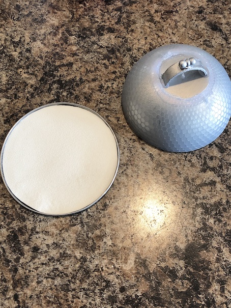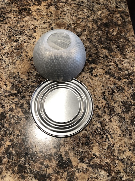 Hot glue the disc in the top of your dome. Next, find a tin can that your dome fits on top of.