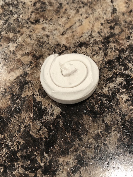 Taper the top edges of your cinnamon roll by rounding them out with scissors. Paint your cinnamon roll brown, and top with a drizzle of white puffy paint.