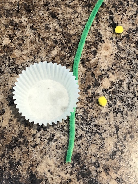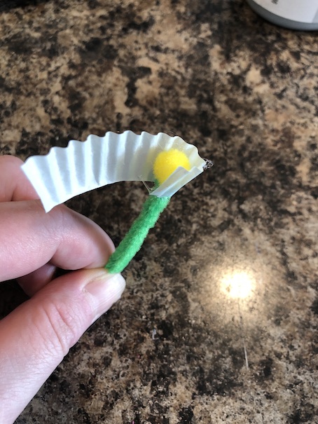 The little tiny vase of flowers, is simply a wooden bead and a button glued together. Then we painted it pink, and painted a white star on it. To make the flowers, you need a pipe cleaner, a muffin liner, and two tiny yellow pom poms.