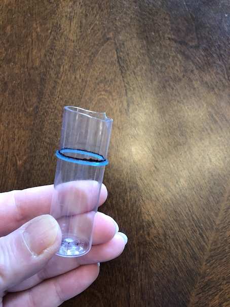 Time to measure and cut. I always have trouble cutting cylindrical things evenly, so I just use a rainbow loom elastic to help me draw a straight line.
