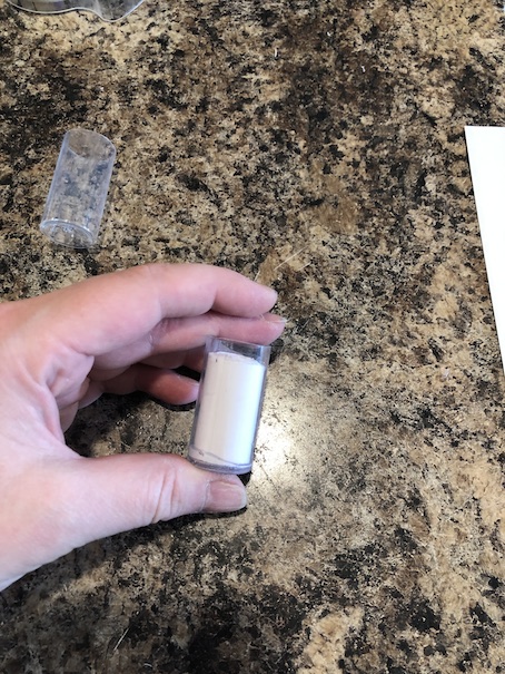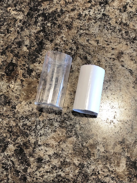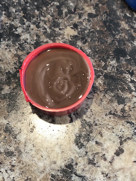 This is what you will have because you will have pre-measured. Your “milk” will be half an inch shorter than your doll cup. Put a blob of hot glue in the middle of the bottom of the “milk” and insert it into the cup. I say only put the hot glue in the middle of the milk bottom because you don’t want the hot glue to smear all up the inside of your cup when you go to slide the milk in.